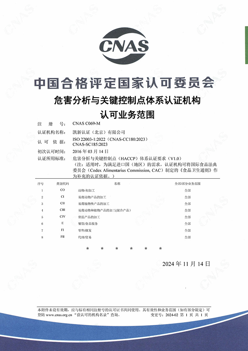 CNAS認(rèn)可HACCP范圍