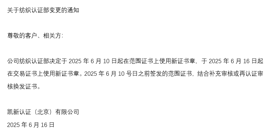 工作通知關(guān)于紡織認(rèn)證部認(rèn)證證書(shū)變更的通知